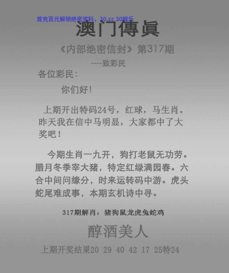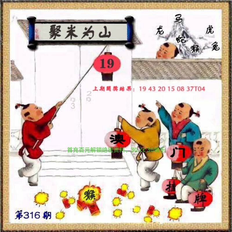 | 317期精解传真: 今期生肖一九开,狗打老鼠无功劳。 腊月冬季宰大猪,特定红绿满园春。 六合中间问缘分,时来运转码中游。 虎头蛇尾难成事,本期玄机诗中寻。 醇酒美人 解:今期腊月冬季宰大猪,解家禽生肖牛猪鸡羊狗马,特定红绿满园春,解红波。 综合:鸡猴羊鼠狗牛兔龙虎 主特:09.34.35.18.32.05.39.38.40 |