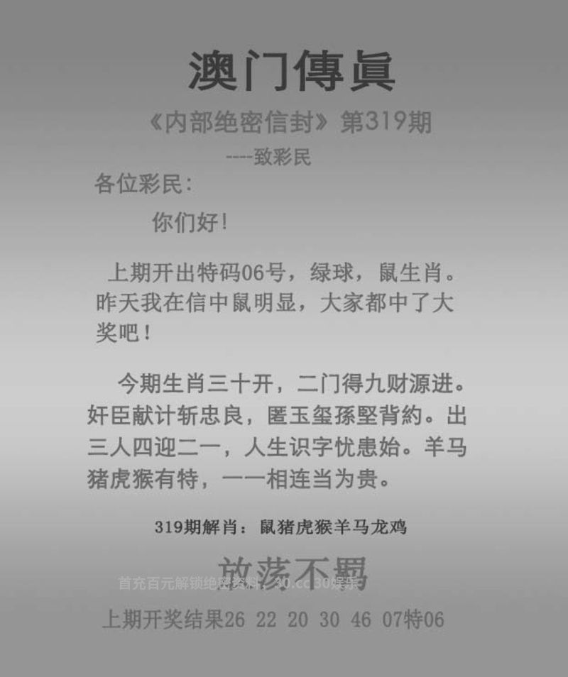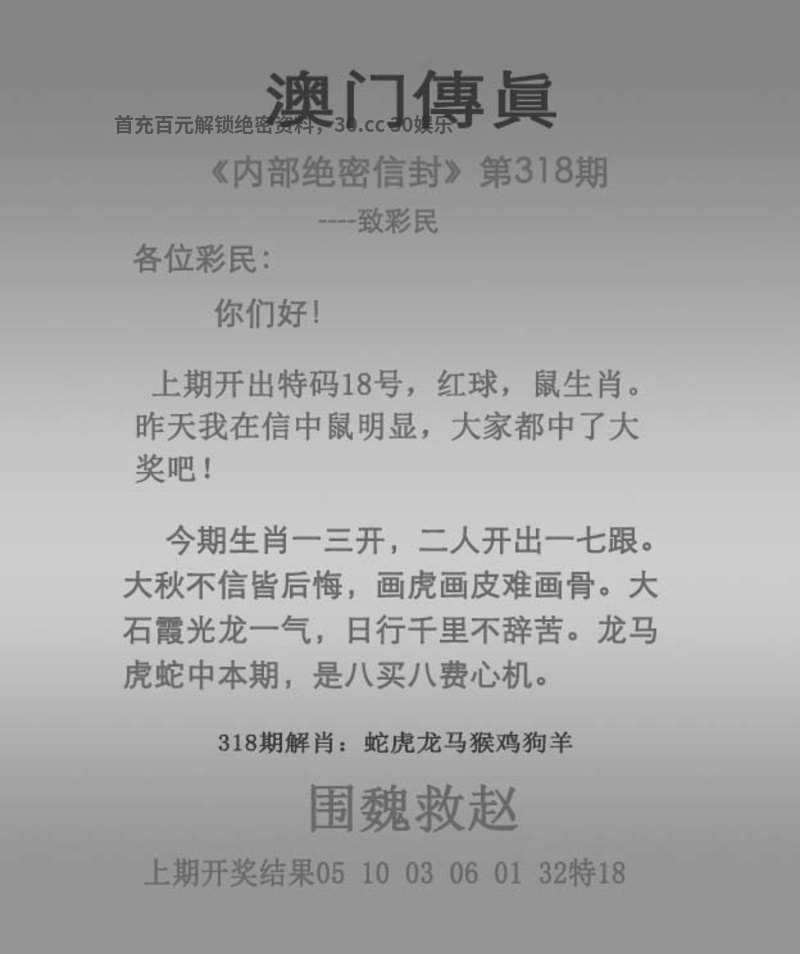 | 318期精解传真: 今期生肖一三开,二人开出一七跟。 大秋不信皆后悔,画虎画皮难画骨。 大石霞光龙一气,日行千里不辞苦。 龙马虎蛇中本期,是八买八费心机。 围魏救赵 解:今期大秋不信皆后悔,解大肖牛虎马羊狗猪,日行千里不辞苦,解日肖龙兔蛇马羊猴。 综合:鼠龙牛马虎鸡猪兔猴 |