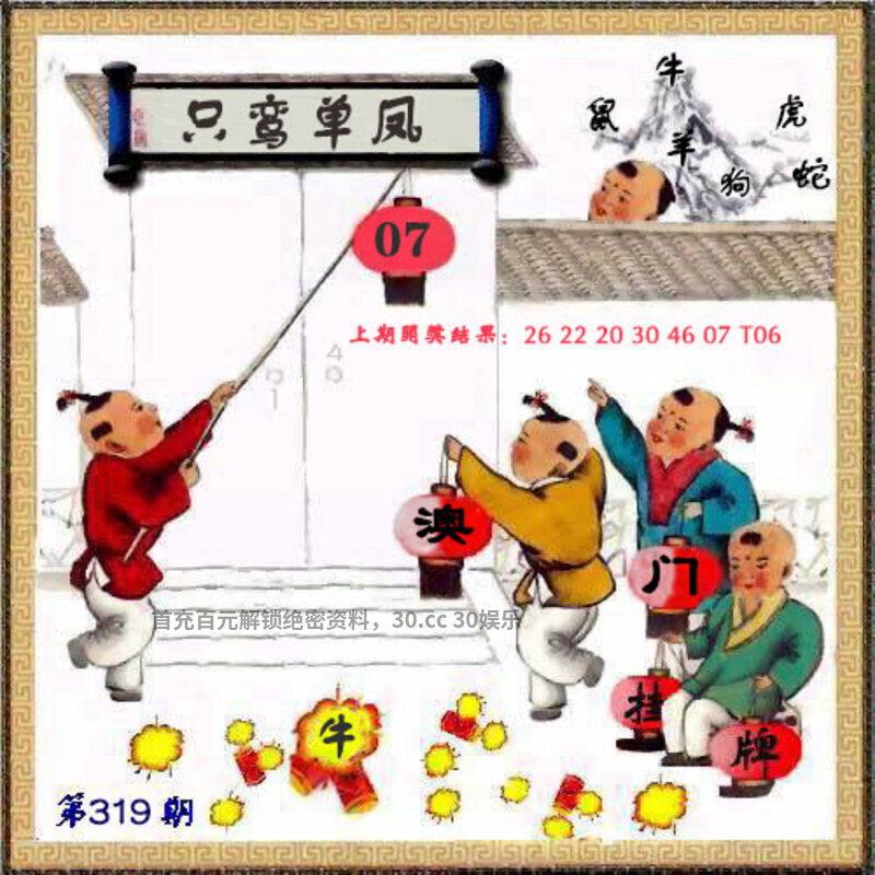 | 319期挂牌《只鸾单凤》 解释:意为孤零零的一只凤凰。 解:单凤解单数鸡蛇兔牛羊猪,挂:07 爆:牛。 综合:鸡蛇兔牛羊猪鼠 |